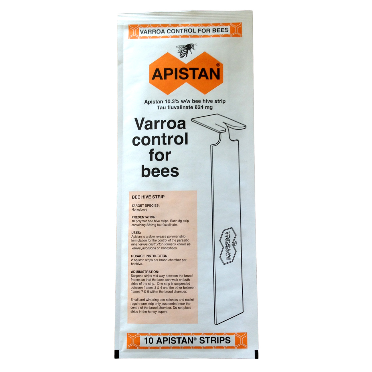 Апистан для пчёл – поливинилхлоридные полоски для защиты обитателей улья от варроатоза, вызванного гамазовым клещом, купить которые также можно для профилактики, если возникло малейшее подозрение. На одной основе из поливинилхлорида содержится 1000 мг основного действующего вещества – флувалината. В одной упаковке 10 отдельных пластин размером 3 см х 25 см, толщина каждого элемента – 2 мм. Каждая пластина размещена в надёжной таре из фольги и полиэтилена, что позволяет сохранить действие препарата в течение всего срока годности.