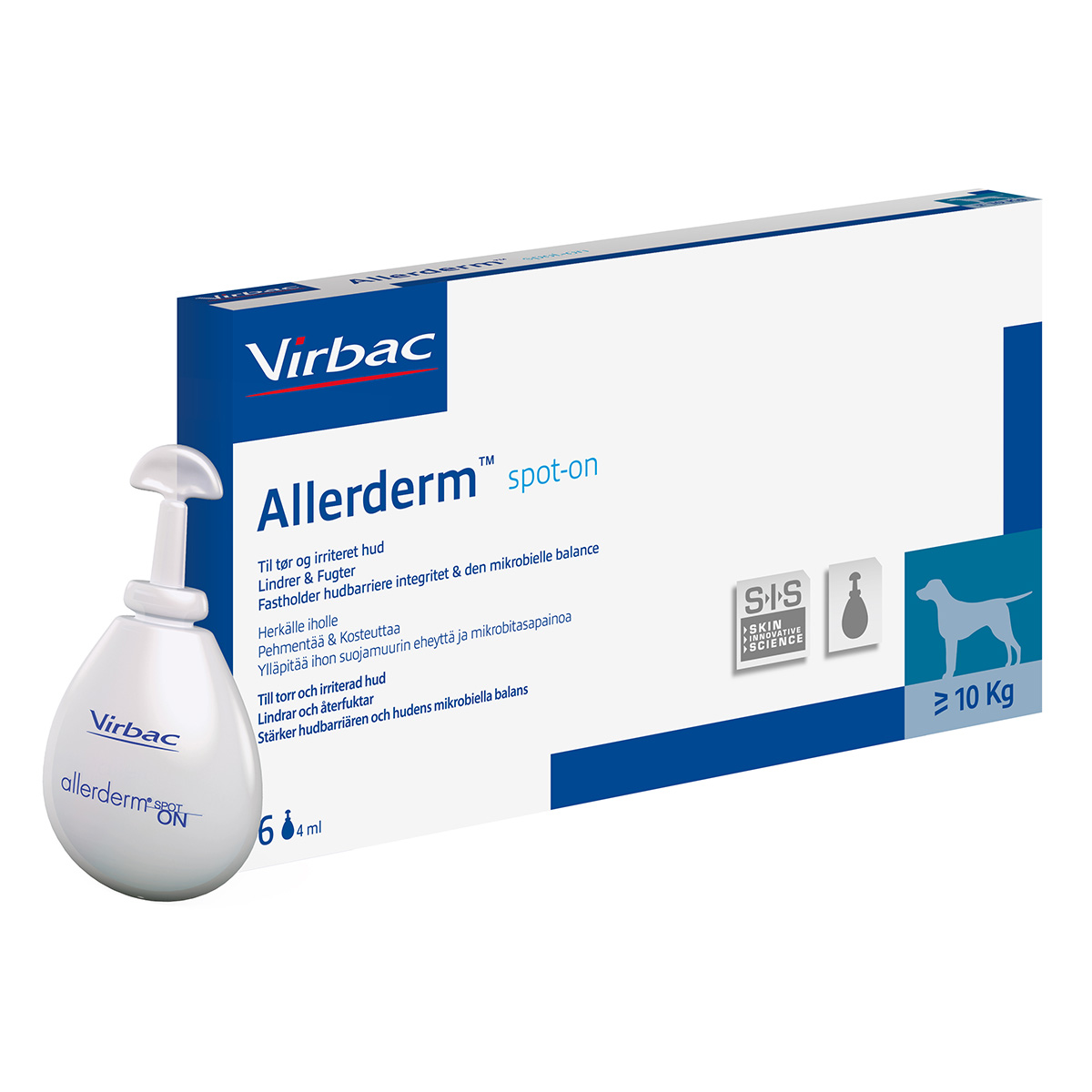 Аллердерм Спот он для собак 4 мл – капли в пипетках для наружного применения при аллергическом и атопическом дерматите, также препарат рекомендуют купить при других дерматологических недугах и с целью профилактики. Капли назначают животным с массой тела более 10 кг. В состав лекарства входят: керамиды, камедь ксантановая, натрия лауроил лактитат, холестерол, вода.  Лекарственное средство имеет прозрачный цвет, специфический запах.  Тюбик-пипетки сделаны из пластика, при использовании кончик нужно повернуть в любую из сторон и вскрыть ёмкость. При открытии пипетку держим вертикально. В одной упаковке 6 пипеток по 4 мл.